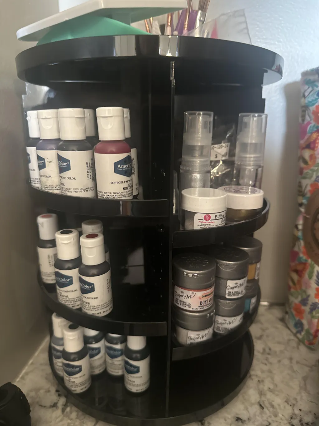 The Best Organizer for all of your sugar art colors and baking supplies! The Color Carousel accommodates all Sugar Art Colors, plus some small tools, paint brushes and large jars! It has total flexibility to adjust the shelving to meet your baking supply needs. You will absolutely love this organizer for all of your baking supplies.